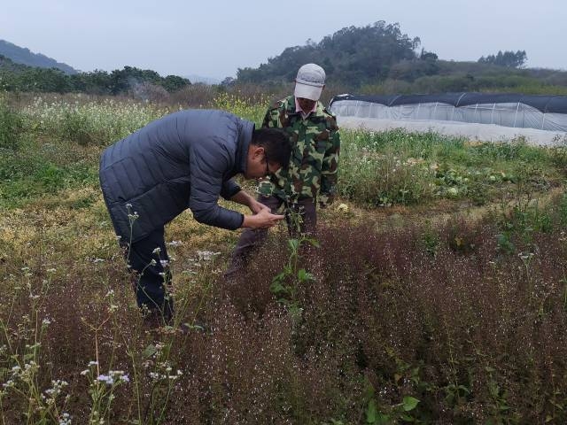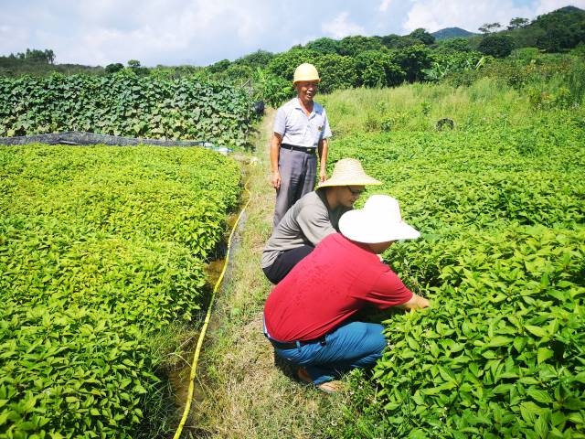 殷秀才与药企技术员察看贫困户家溪黄草的种植情况。