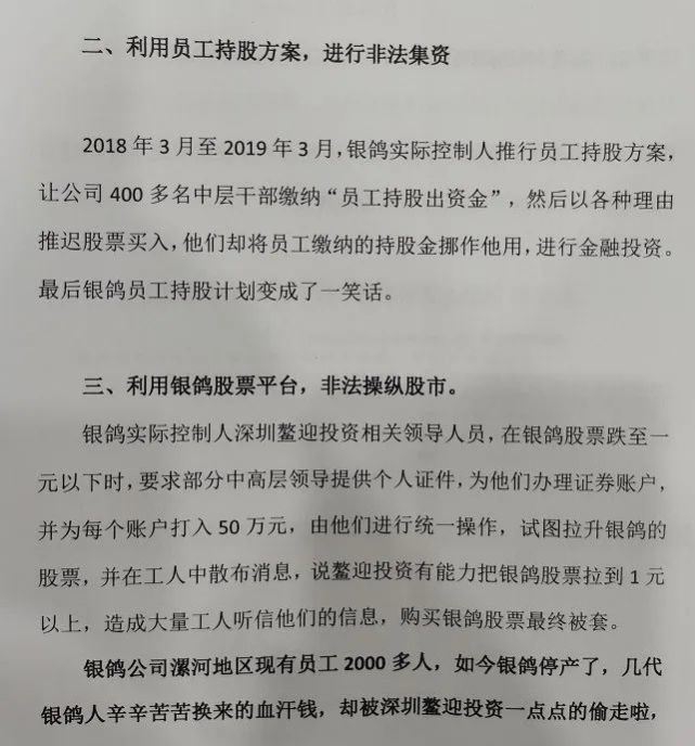 在*ST银鸽工作的知情人此前告诉笔者,5月中下旬跌破面值后,*ST银鸽实控人孟飞和上市公司董事长顾琦曾鼓动员工投入自有资金帮助公司救市。顾琦曾在上市公司较大范围会议中亲口说“鳌迎投资有能力把银鸽股票拉到1元以上”、“如果没涨上去,鳌迎承诺弥补大家的损失”,公然鼓动员工接盘,造成大量工人听信,并最终在6月9日全部被套。