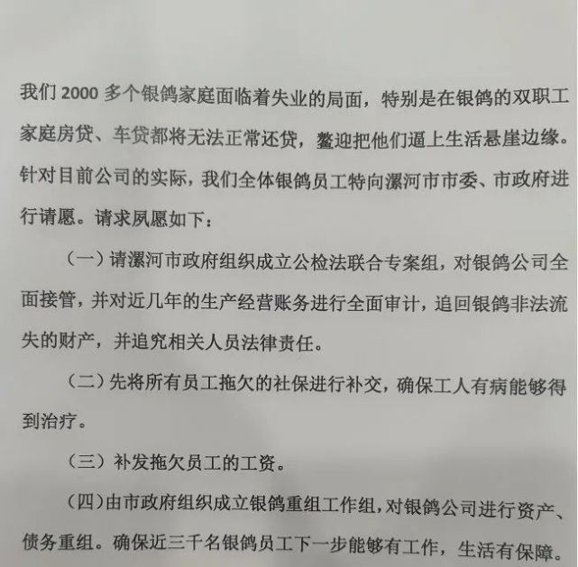 笔者独家获悉了一份由上市公司员工于6月16日签署的、给漯河当地政府的《请愿书》文字稿,其中亦有孟飞、顾琦鼓动员工接盘的相关表述。