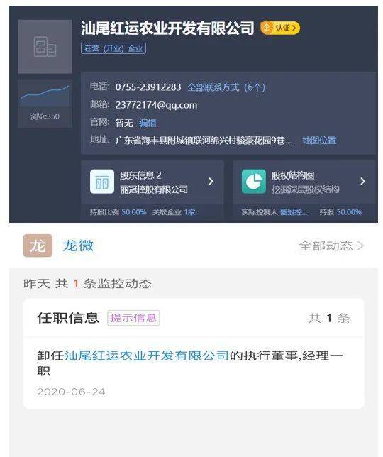 笔者注意到,今年6月24日,该女子辞去了一家名为汕尾红运农业开发有限公司的执行董事(法人)、经理。而该公司的监事,正是孟飞团伙核心成员倪晓燕。
