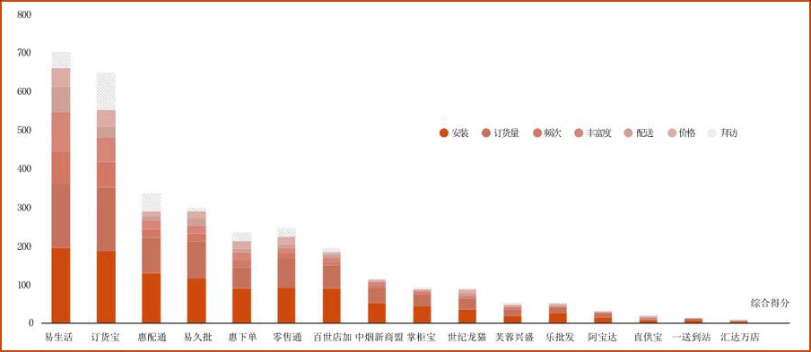 2018年,调研团队根据安装量、订货量等7个指标为重庆市场16家参与者评分,易生活以703分完胜阿里零售通、中商惠民等巨头。