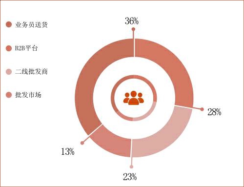 而今,凭借28%的占比,快消B2B平台已跃居夫妻店进货渠道第二位,仅次于业务员送货的36%。
