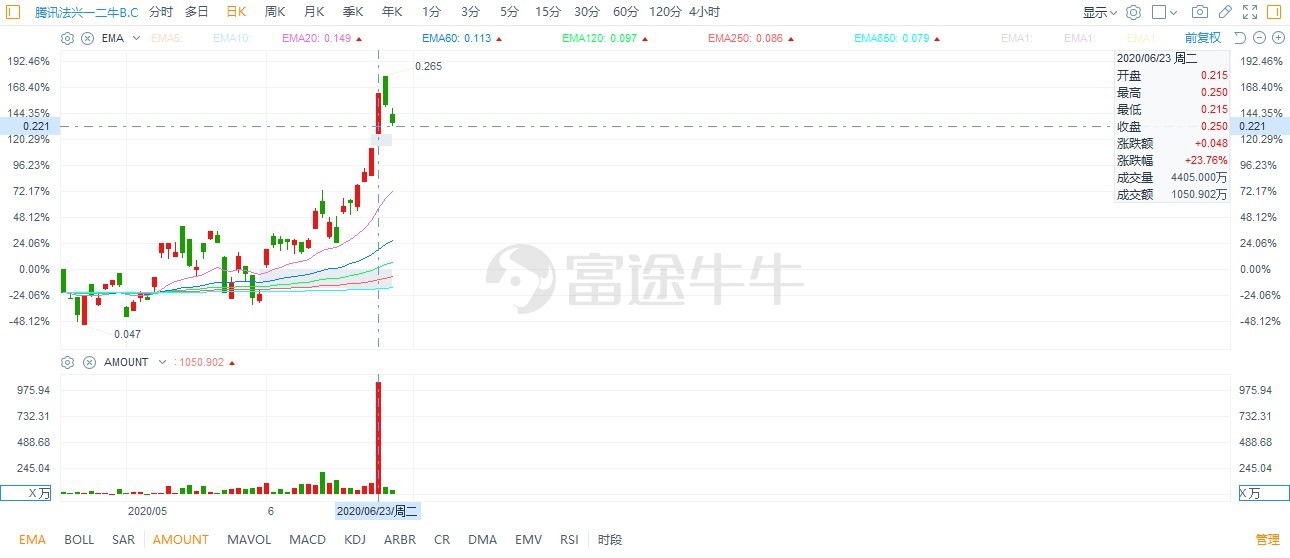 我们可以先看下这只牛证的行情,可以看到它最近跟随腾讯的涨势,大幅上涨,在6月一整月,涨幅达到了208%,而腾讯在此区间的涨幅是18%,可以看到明显的杠杆效应。