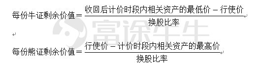 可能有人会问,被收回后,真是一点渣都不剩了吗?这里简单说下,牛熊证分两类,N类(不设余额)牛熊证被收回时将没有任何价值,R类(设有余额)牛熊证被收回后投资者可能会获得部分剩余价值,也可能血本无归。计算R类牛熊证剩余价值的公式如下: