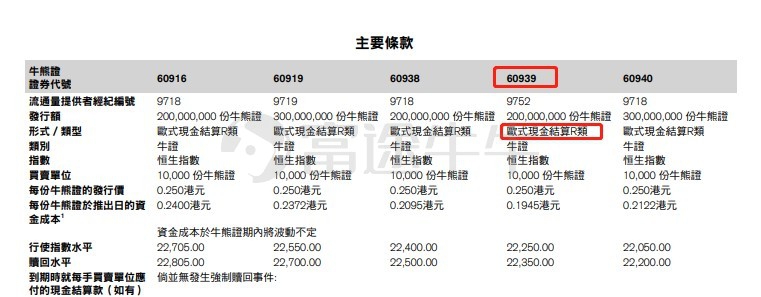 举个例子,60939这只牛证,收回价是22350,行使价是22250,如果恒指某个交易日跌至22350该牛证被收回,当天最低又跌至22300,那么每股牛证剩余价值就是(22300-22250)/10000=0.005港币,相比目前0.18元的价格来说,已经亏掉95%以上。如果当天恒指最低跌破22250,那么就没有剩余价值了。如有剩余价值,相关结算金额将会于计价后约3个结算日,自动过户至中央结算所,继而自动过户至投资者的证券户口。
