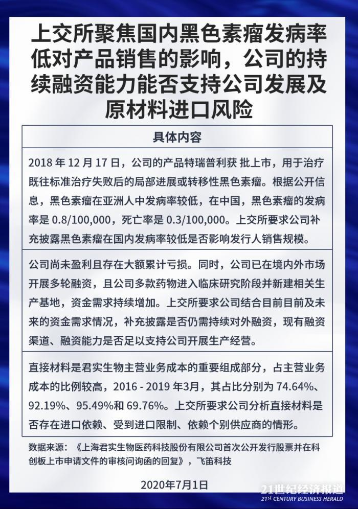 上交所关注的问题中,国内黑色素瘤发病率低对产品销售的影响,公司的持续融资能力能否支持公司发展以及原材料进口风险值得大家注意。