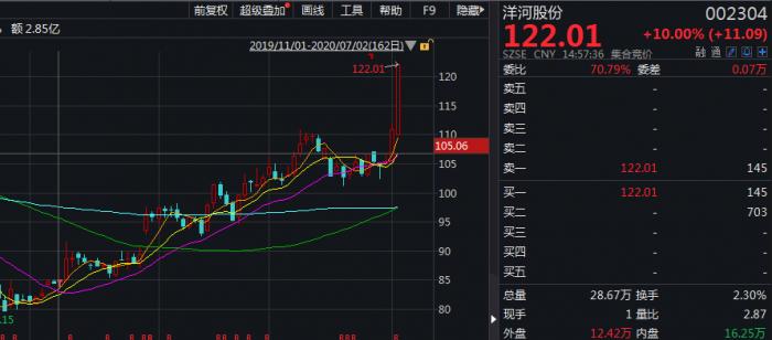 7月2日午后,洋河股份涨停,同期贵州茅台、五粮液盘中涨幅则分别为2.86%和4.41%。