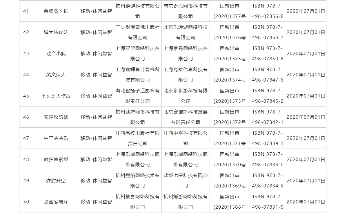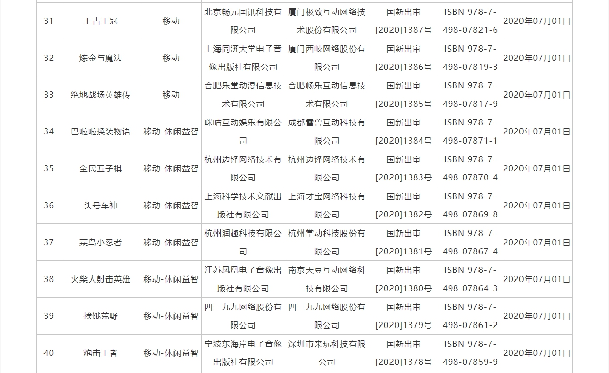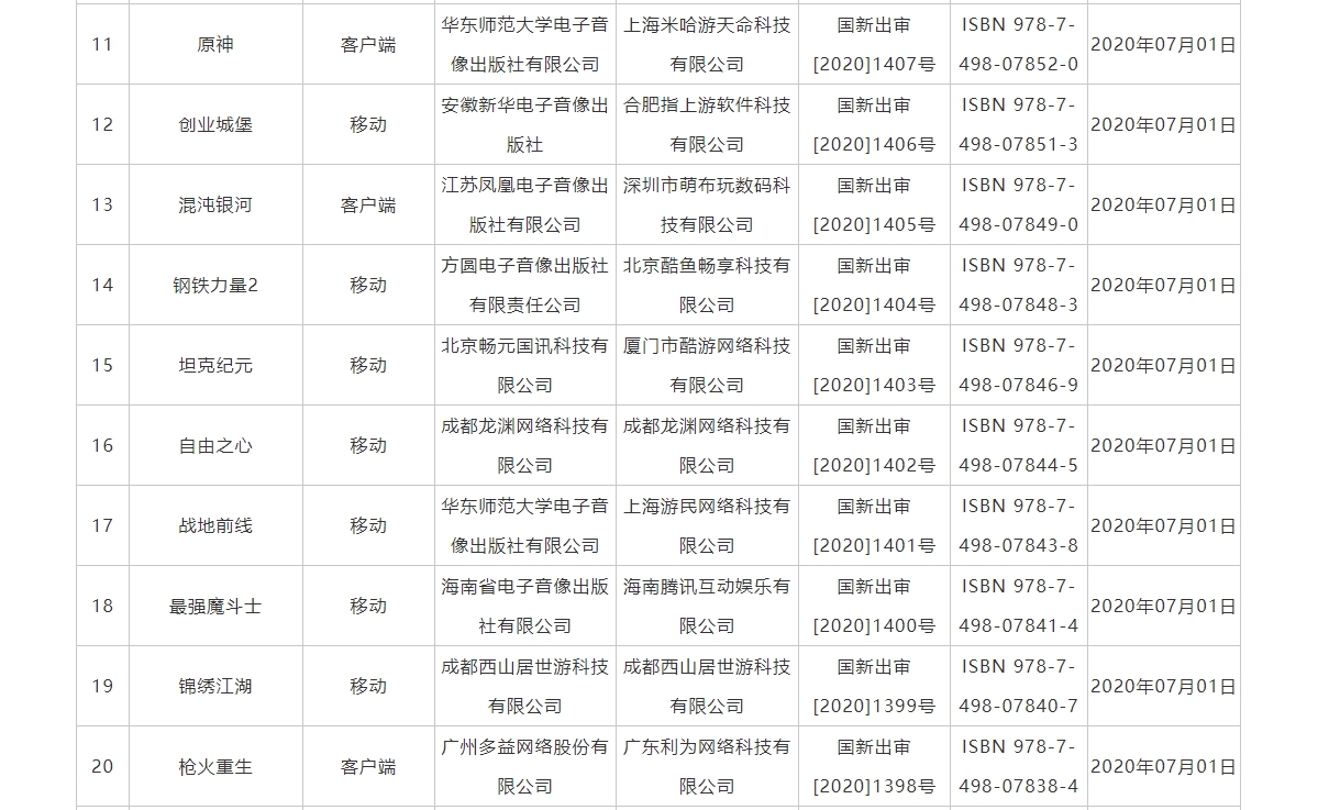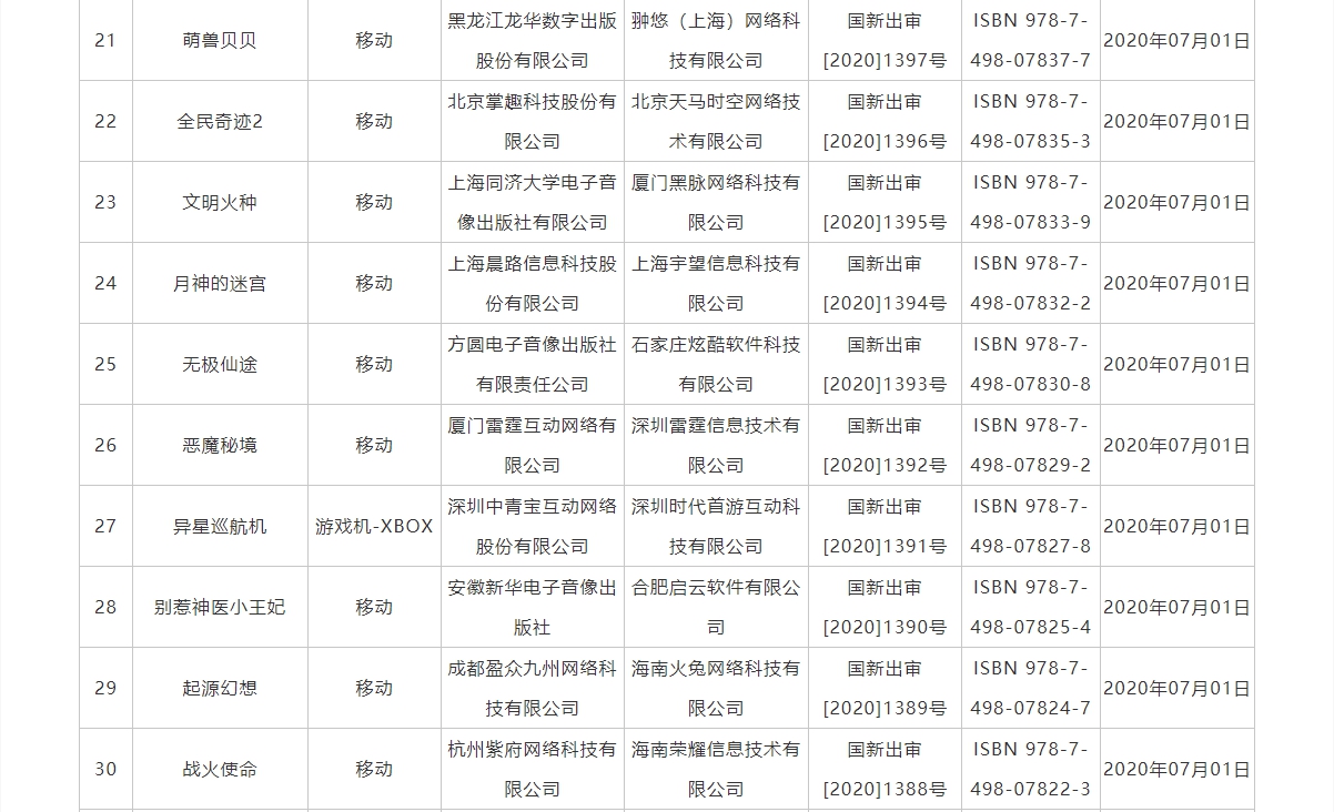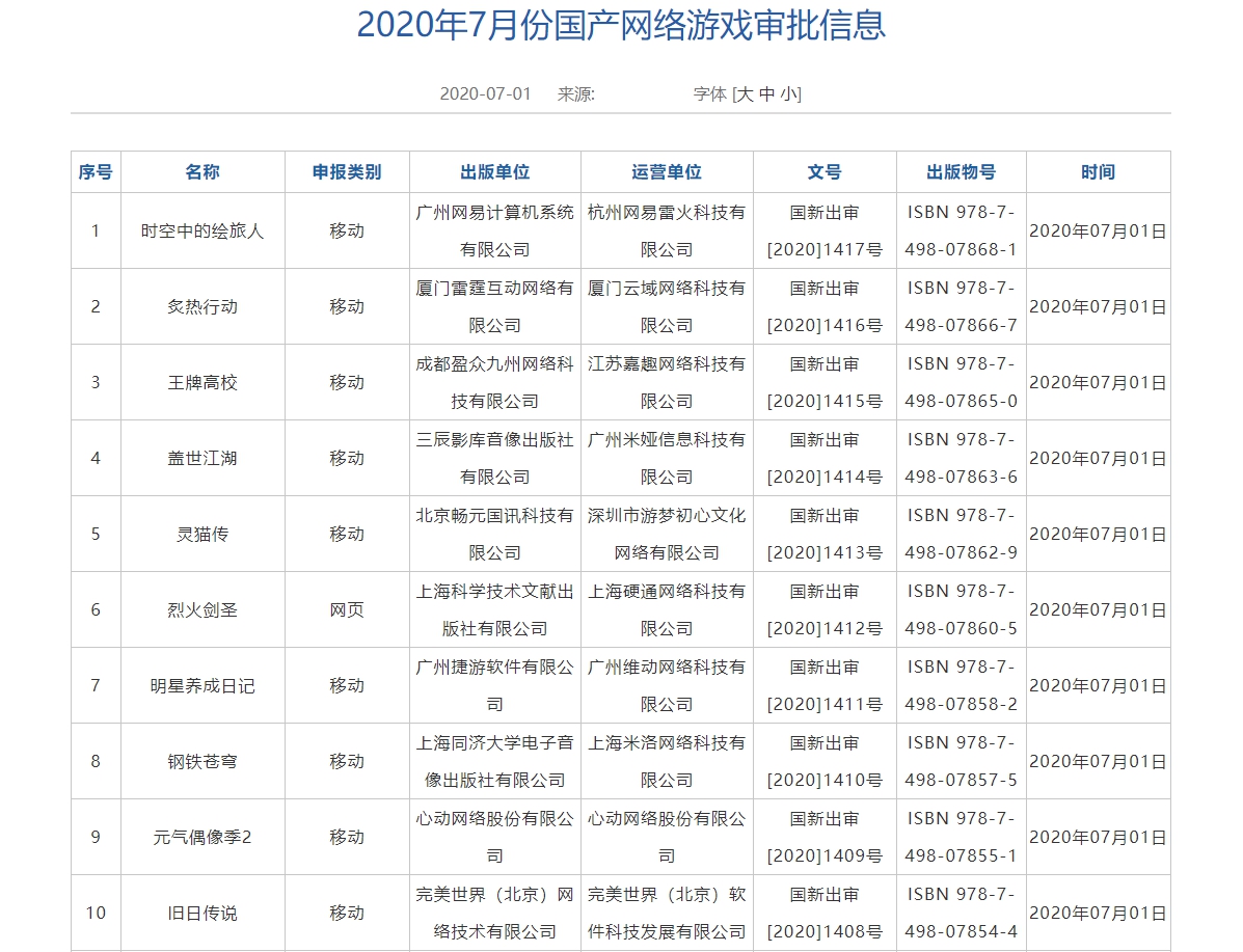 7月1日讯,国家新闻出版署1日公布2020年7月份国产网络游戏审批信息,其中包含网易的《时空中的绘旅人》、腾讯控股的《最强魔斗士》、掌趣科技的《全民奇迹2》、中青宝的《异星巡航机》。