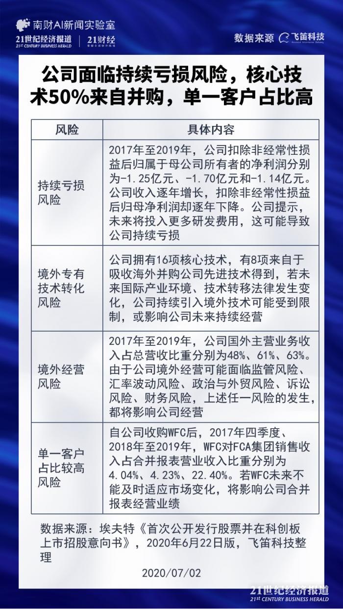 最后为单一客户占比较高风险。据公司招股书,FCA集团是公司子公司WFC主要客户之一。2017年至2019年,子公司对FCA集团的毛利率水平分别为39.97%、37.71%、30.24%,高于WFC其他客户的毛利率。自公司收购WFC后,2017年四季度、2018年度、2019年度,对FCA集团销售收入占公司合并报表营业收入比重分别为4.04%、4.23%、22.40%。公司提示,在FCA集团销售占比较高的情况下,若WFC未来在技术升级、业务开拓上不能及时适应市场变化,将对其生产经营产生负面影响,从而影响公司的合并报表经营业绩。