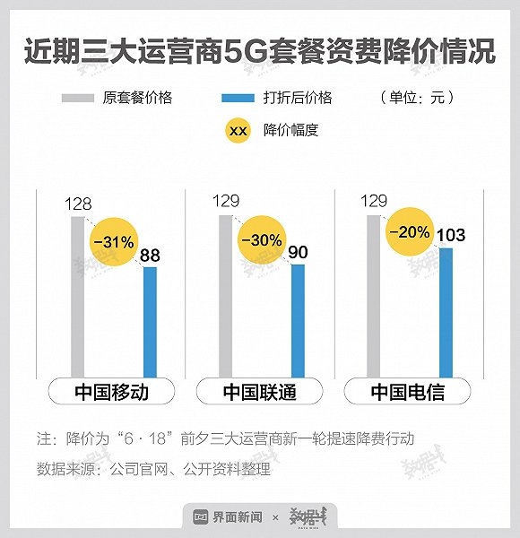 “6·18”前夕,三大运营悄悄开启了自 5G 商用以来的首次降价潮。中国移动折扣较大,最低档套餐从128元降至88元,降幅达31%;中国联通最低档套餐也从129元降至90元,降幅为30%;中国电信129元套餐折后为103元,降幅较小,仅为20%。