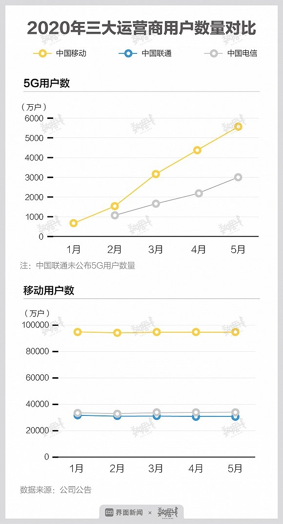 从移动用户总数来看,2020年5月,中国移动、中国电信、中国联通的用户数分别为9.47亿户、3.09亿户和3.41亿户。从趋势来看,中国移动和中国电信的用户数连续三个月上升,而中国联通则连续两个月下滑。