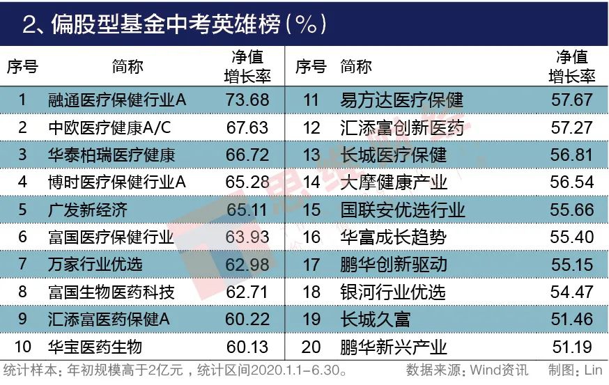 偏股型基金中,有10只上半年盈利超过60%,融通医疗保健行业A盈利74%位列榜首,领先第二名约6个百分点。