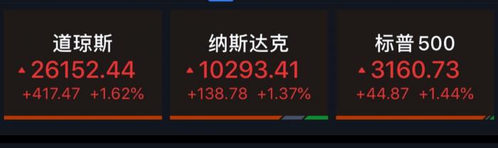7月2日,美国股市三大指数大幅高开,截至发稿,道指上涨1.62%,纳指上涨1.37%,标普500指数上涨1.44%。