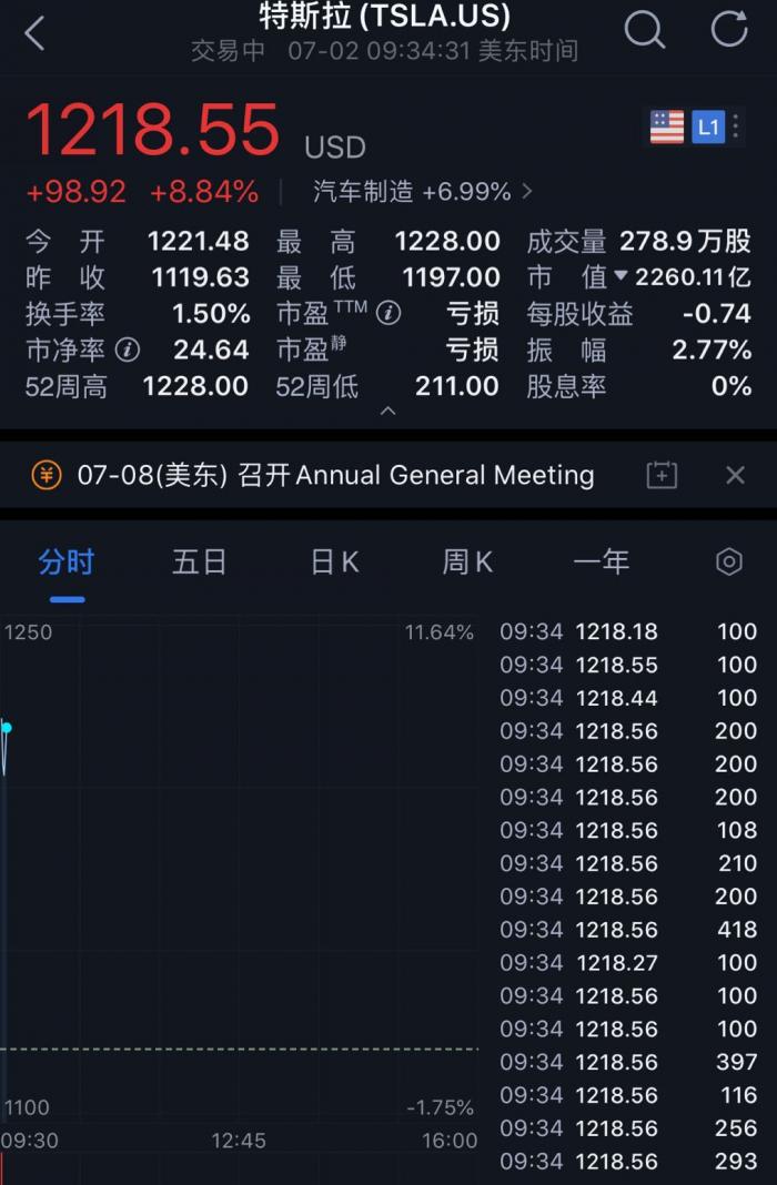 个股方面,特斯拉股价大涨8%,再创历史新高。截至发稿,特斯拉上涨8.84%,报1218.55美元/股,流通市值达2260.11亿美元。