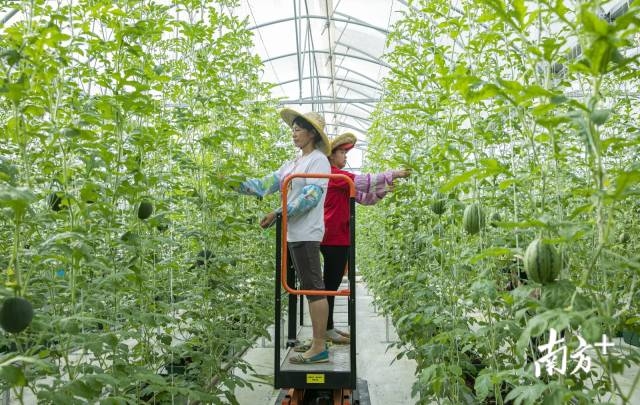 “在家门口就能种西瓜,收入不少,也能照顾家,这样的生活,还有什么不满意的?”村民张顶娣戴着斗笠,站在温室大棚专用作业车上,边说边忙着修剪挂在半空的藤条。