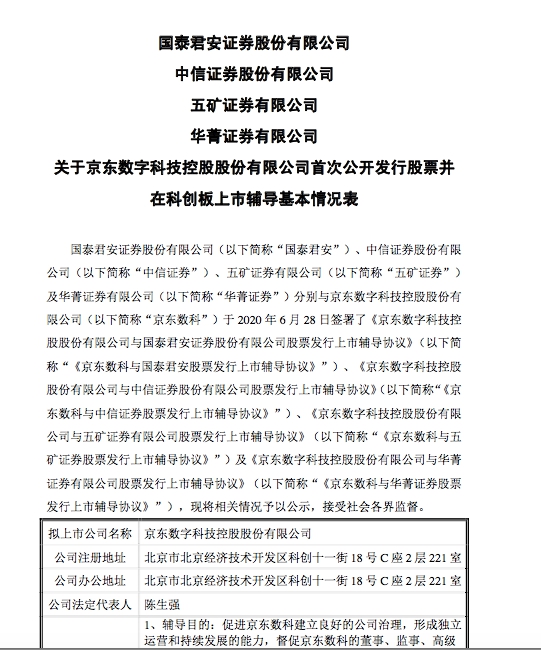 7月1日,证监会网站公布了《关于京东数字科技控股股份有限公司首次公开发行股票并在科创板上市辅导基本情况表》显示,国泰君安证券股份有限公司、中信证券股份有限公司、五矿证券有限公司及华菁证券有限公司分别与京东数字科技控股股份有限公司于2020年6月28日签署了《京东数字科技控 股股份有限公司与国泰君安证券股份有限公司股票发行上市辅导协议》,证实了这一消息。
