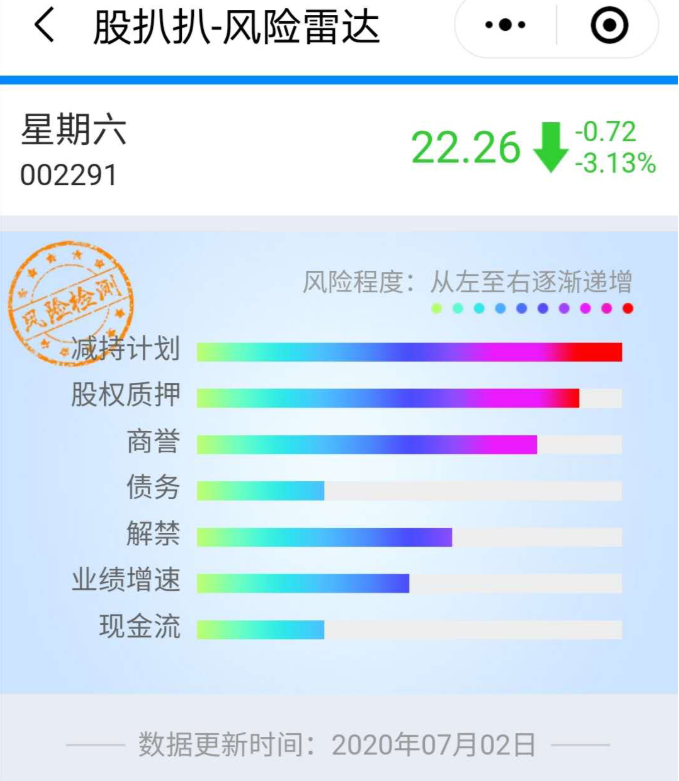 其实,对于这类个股风险,我们可以用专业的风险排除工具,股扒扒小程序来提前看一下。比如输入002291,就可以看到星期六相关信息。