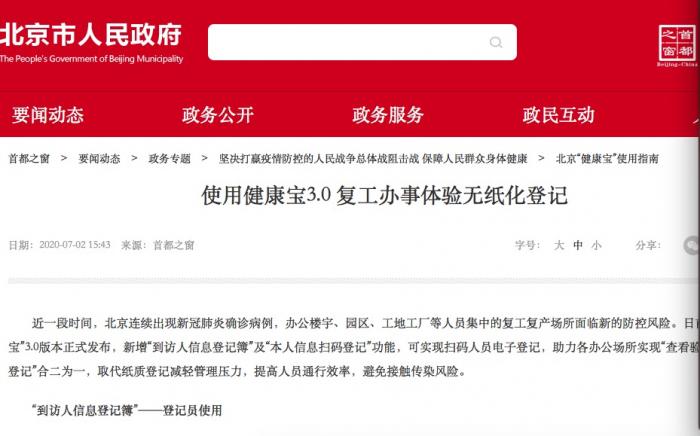 据了解,首都之窗消息,日前“健康宝”3.0版本正式发布,新增“到访人信息登记簿”及“本人信息扫码登记”功能,可实现扫码人员电子登记,助力各办公场所实现“查看验码”、“纸质登记”合二为一,取代纸质登记减轻管理压力,提高人员通行效率,避免接触传染风险。