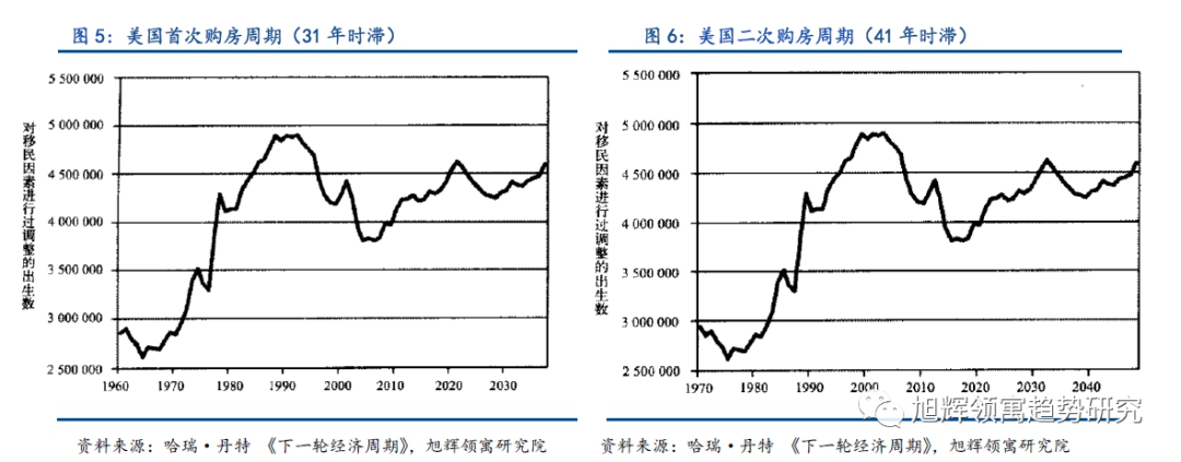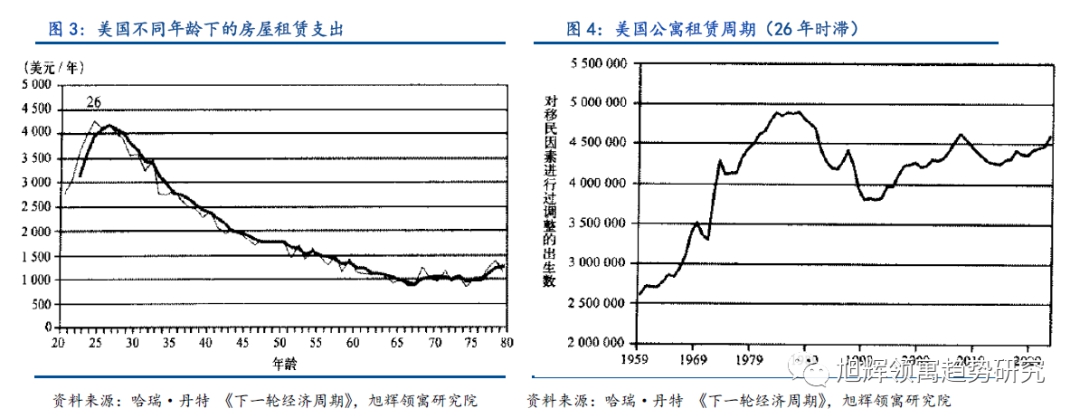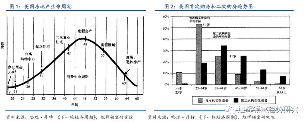 以美国为例,美国家庭平均在26岁结婚,30岁左右有孩子,因而在26~33岁之间租房需求和次购房需求爆发。在37~42岁时,孩子开始进入高中,因此催生了改善性购房需求。美国劳工统计局的数据表明,美国人在26岁时在房屋租赁上的花费最高。美国地产经纪商协会的统计数据表明,典型的首次住宅购房者年龄是31岁,而二次购房者的平均年龄为41岁。这也使得租房需求峰值相对于出生指数存在26年的时滞,首次购房需求峰值相对于出生指数存在31年的时滞,即婴儿潮一代的购房需求峰值在1987~1991年间达到。该峰值的来临也导致了20世纪90年代初期美国的储贷危机和房产价值小幅缩水。婴儿潮一代在1997~2001年进入二次购房需求的顶峰,并在度假房产需求和地产投机的推动下,导致了2000~2005年的房地产泡沫。