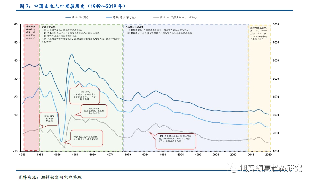 1949年以后,中国人口发展主要经历了四个阶段。第一个阶段是1949~1954年,国家鼓励生育,限制节育和人工流产。第二个阶段是1955~1977年,开始实施节制生育政策。第二个阶段是1978~2013年,1978年计划生育纳入宪法,独生子女政策全面实施。第四个阶段始于2014年,单独二孩、全面二孩政策陆续出台。从出生人口数量来看,建国后中国经历了三波婴儿潮(出生人口连续高于2000万)。第一波诞生在1950~1957年,战后经济社会稳定使得出生人口增长,出生率维持在30‰以上,年均出生2121万。第二波诞生于1962~1975年,出生率在三年困难时期过后大幅反弹,仅1972~1975年出生率介于20‰~30‰之间,年均出生2628万。第三波诞生于1981~1997年,虽然出生率低于前两次婴儿潮,但依然维持在16‰以上。第二波婴儿潮带来的育龄人口高基数,使得年均出生人口达到2212万。