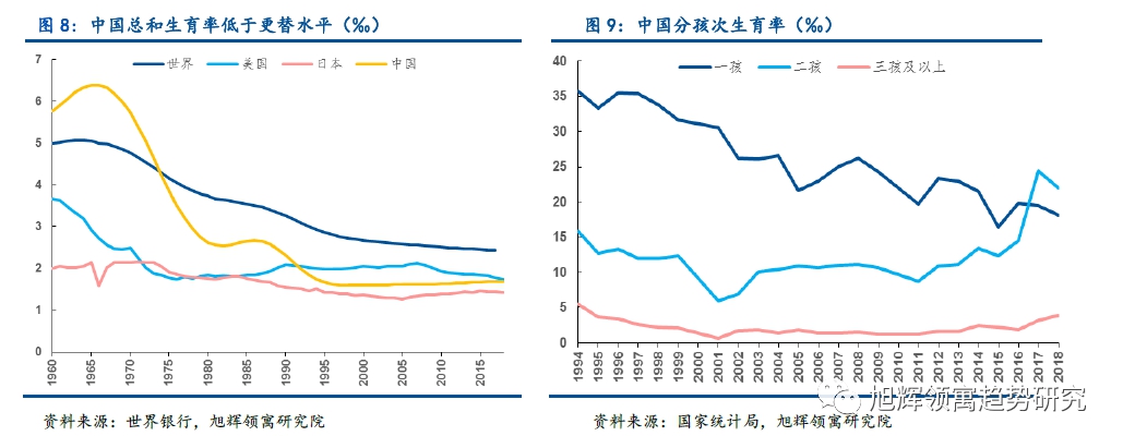 生育率为总出生数与相应人口中育龄妇女人数之间的比例,亦称育龄妇女生育率。因分析目的不同,生育率可分为一般生育率、分年龄生育率、孩次生育率、分年龄孩次生育率、标准化生育率、总和生育率、累计生育率、终身生育率等类型。其中,总和生育率把所有年龄别生育率等权重相加,表示当年每个妇女15到49岁时生育孩子的总数,是衡量生育水平最常用的指标之一,大致相当于平均一个妇女一生生育多少孩子。中国的总和生育率自1992年开始低于2.1的世代更替水平,到1999年已经降至1.49。之后虽缓慢回升,到2018年也仅为1.69,既低于世界平均水平,也低于美国。分孩次生育情况看,三孩生育率一直维持在较低水平,一孩生育率持续走低,二孩总和生育率在2017年由14.48‰大幅上升至24.36‰后,2018年又回落至21.97%。