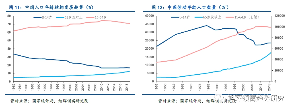劳动力人口下降,中国进入人口红利后半期。从人口的年龄结构来看,自1982年以来,0~14岁人口占比不断下行,65岁以上人口占比不断提升,而15~64岁的劳动力人口占比自2010年达到峰值74.5%后开始下行,2019年降至70.7%。从绝对数量来看,15~64岁的劳动年龄人口自2013年开始持续减少。65岁以上人口自2011年加速上升,到2019年已经达到1.76亿。0~14岁人口在1982年达到峰值后开始下行,1990~1999年有所企稳后再度下行,至2011年再次小幅反弹,2019年再次较2018年有所回落。
