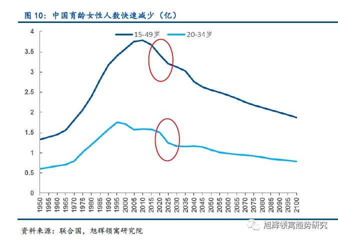 中国育龄女性人数持续减少。根据联合国《世界人口展望2019》,中国15~49岁的女性人数自2010年达到峰值3.79亿后开始持续减少。近年来中国育龄妇女数量平均每年减少500万左右。2019年15~49岁育龄妇女人数比2018年减少500多万人。预计2020年较2019年再度减少500万,之后虽降幅略有减少,但2025年仍会较2020年减少约2155万。其中,生育率较高的20~34岁女性人数自1995年达到峰值1.75亿后快速下降至2005年的1.57亿,在2010年回升至1.60亿后再次下滑。中性情景下20~34岁女性人数在2025年将大幅降至1.25亿,较2020年减少近2480万;2030年降至1.17亿,较2020年减少约3292万。育龄女性减少叠加总和生育率下降,将使得中国出生人口快速减少。