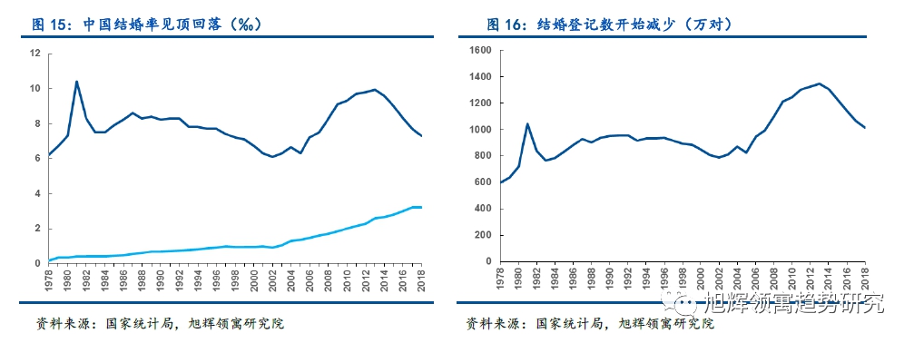 2005年开始,中国的粗结婚率快速上升,在2013年达到9.92‰,之后降至2018年的7.3‰。粗离婚率则持续上升,自2002年的0.9‰升至2018年的3.2‰。与此同时,中国结婚登记数自2013年的1346.9万对见顶后持续回落至2018年的1013.9万对。