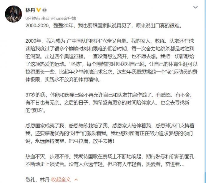 7月4日,羽坛巨星林丹正式在个人微博宣布退出中国羽毛球国家队,带着83个冠军和“双圈大满贯”的辉煌成绩,告别了征战20年的国家队生涯。