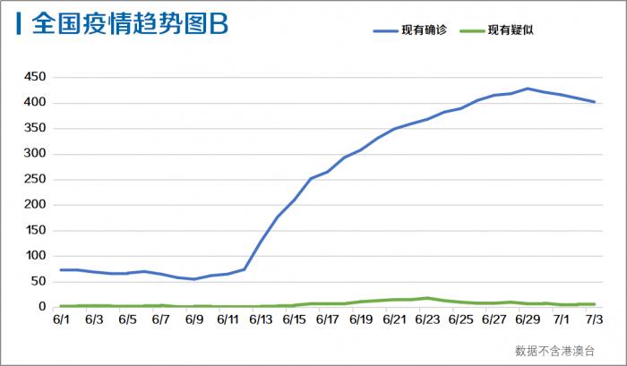截至7月3日24时,新增疑似病例2例,其中境外输入病例1例(在上海),本土病例1例(在北京)。全国现有疑似病例7例。尚在医学观察人数有所下降,7月3日,全国解除医学观察的密切接触者794人,尚在医学观察的密切接触4993人。