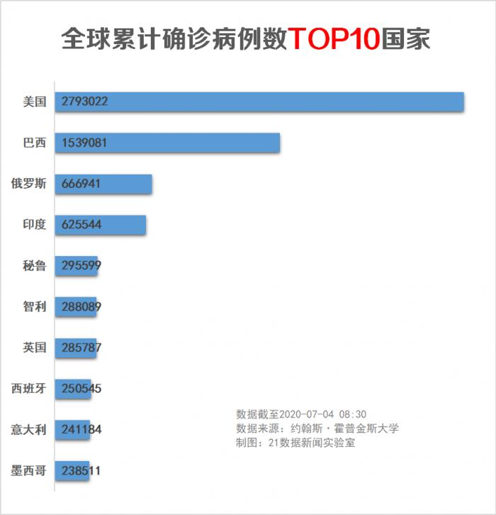 据美国约翰斯·霍普金斯大学发布的统计数据显示,截至北京时间7月4日7时35分,全球累计新冠确诊病例达到11037625例,累计死亡病例为523898例。