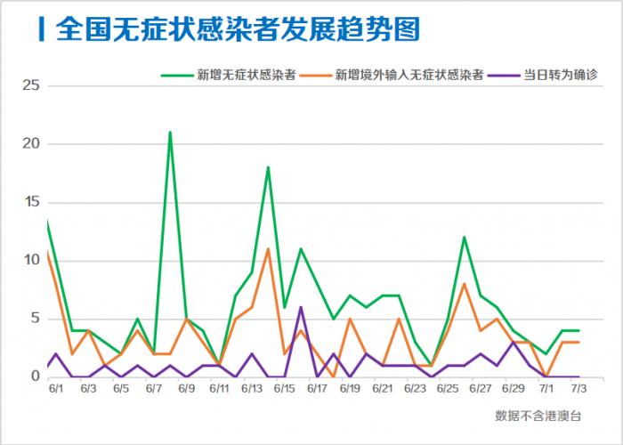 7月3日,全国新增无症状感染者4例(含境外输入3例),其中湖北新增无症状感染者3例(含境外输入2例);当日无转为确诊病例;当日解除医学观察3例(境外输入1例);尚在医学观察无症状感染者98例(境外输入61例)。
