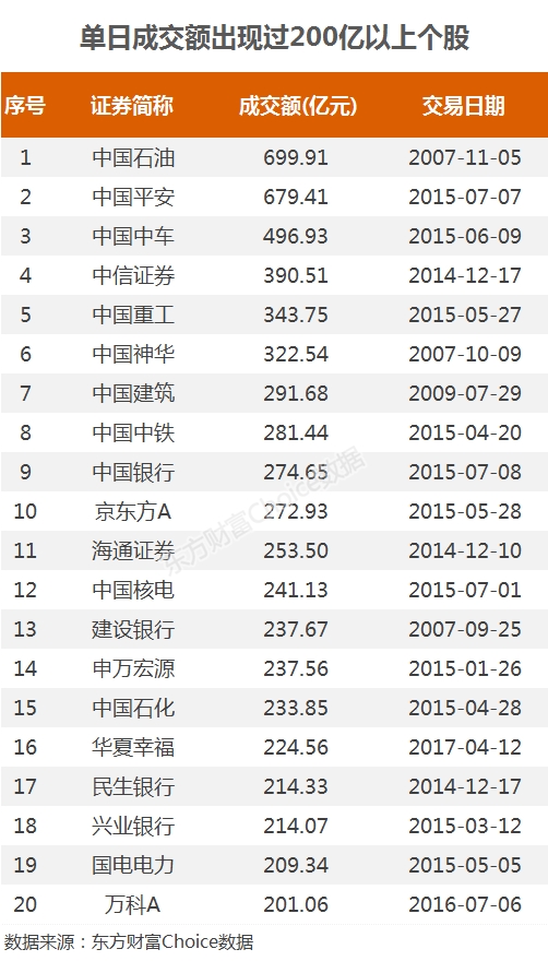 东方财富Choice数据显示,目前A股中,有过单日成交超过200亿的个股仅有20只,且发生日期多在5178点之前的大牛市中,2016年初“熔断”之后,只有万科A和华夏幸福两股出现单日成交超200亿的情况。最近的华夏幸福是2017年4月12日,距今已过去超过3年。