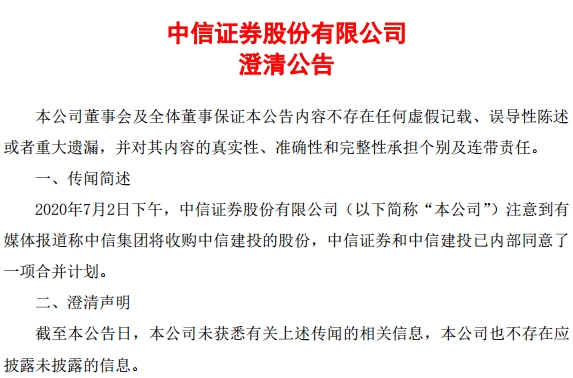 中信证券公告称,公司注意到有媒体报道称中信集团将收购中信建投的股份。截至本公告日,本公司未获悉有关上述传闻的相关信息,本公司也不存在应披露未披露的信息。