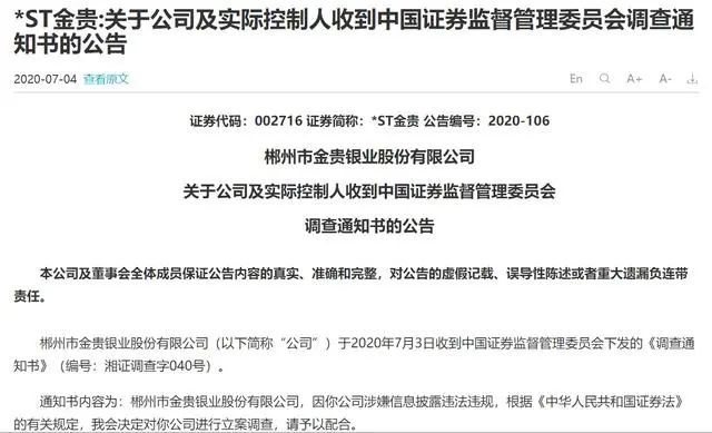 7月4日,曾有“白银第一股”之称的*ST金贵(002716.SZ)公告称,收到中国证监会下发的《调查通知书》,因涉嫌信息披露违法违规,公司及公司控股股东、实际控制人曹永贵遭证监会立案调查。