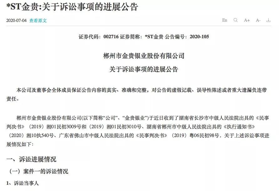 7月4日*ST金贵发布《关于诉讼事项的进展公告》中显示: