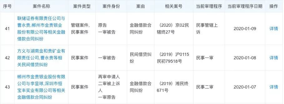 数据显示,年初至今,和郴州市金贵银业股份有限公司相关的司法风险事件高达43起,大部分涉及合同纠纷(和买卖、保证、融资租赁行为相关)、债券交易纠纷、票据纠纷等。