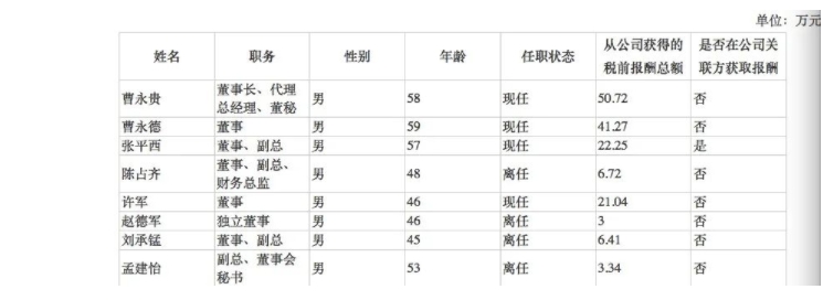值得注意的是,一边是公司年度巨亏,另一边是高官的丰厚薪酬。2019年年报显示,报告期内公司董事、监事和高级管理人员报酬合计328.68万元,董事长、代理总经理、董秘曹永贵从公司获得的税前报酬总额50.72万元;董事曹永德从公司获得的税前报酬总额41.27万元。