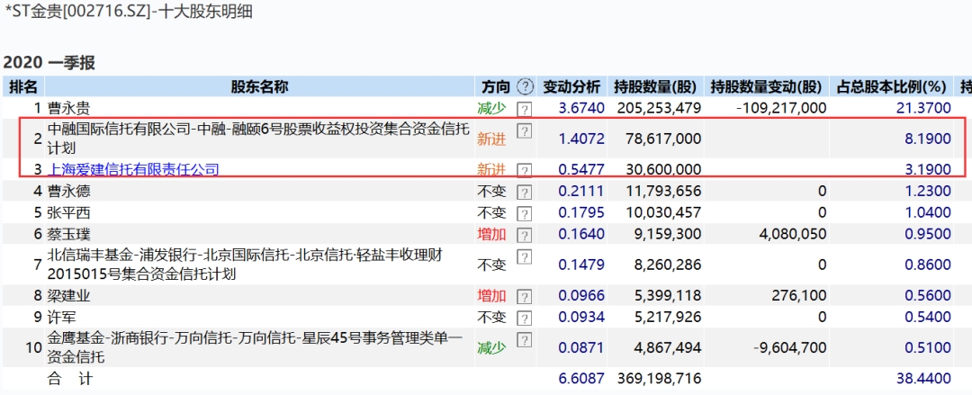 此外,截至2020年一季报,*ST金贵前十大股东里,有2大著名信托身影——爱建信托、中融国际信托,都是一季度新增。