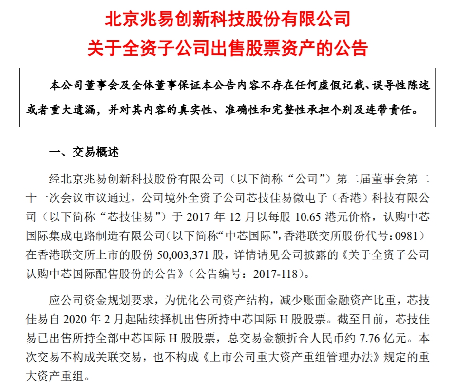 6月29日,A股上市公司兆易创新公告称,全资子公司芯技佳易自2月起陆续择机出售所持中芯国际H股股票,目前已清仓离场,累计套现约人民币7.76亿元。