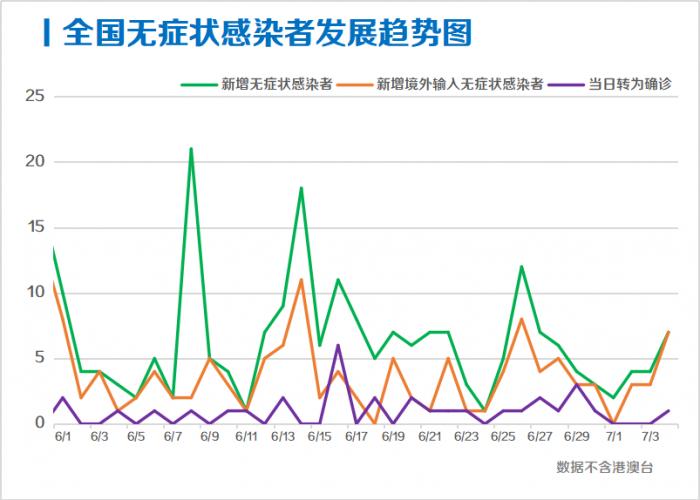 7月4日,全国新增无症状感染者7例,均为境外输入;当日转为确诊病例1例(境外输入1例);当日解除医学观察5例(境外输入4例);尚在医学观察无症状感染者99例(境外输入63例)。