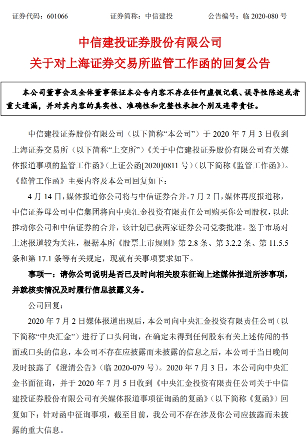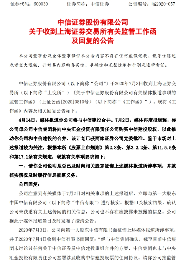 1、中信集团、中央汇金联手辟谣!龙头券商合并要"黄"了?