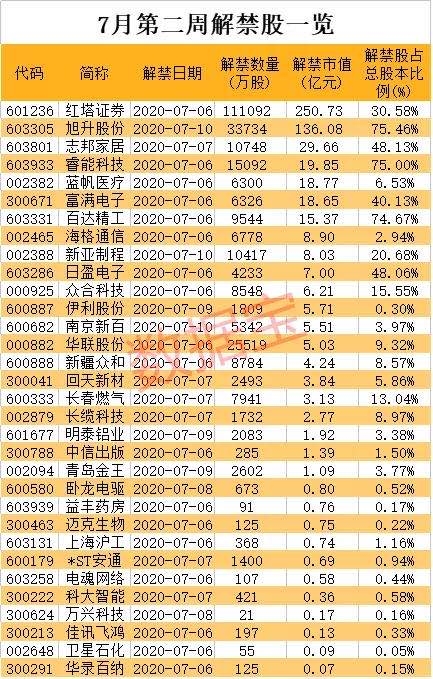 统计显示,不含科创板公司,下周面临解禁个股32只,以最新收盘价计算,合计解禁市值559亿元。按一季度末股东数据来看,这32股合计股东达到140万户。7股解禁市值在10亿元以上,分别是红塔证券、旭升股份、志邦家居、睿能科技、富满电子、蓝帆医疗、百达精工等。