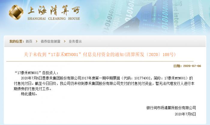 7月6日晚,上海清算所发出未收到泰禾集团2017年度第一期中期票据(简称“17泰禾MTN001”)付息兑付资金的通知。