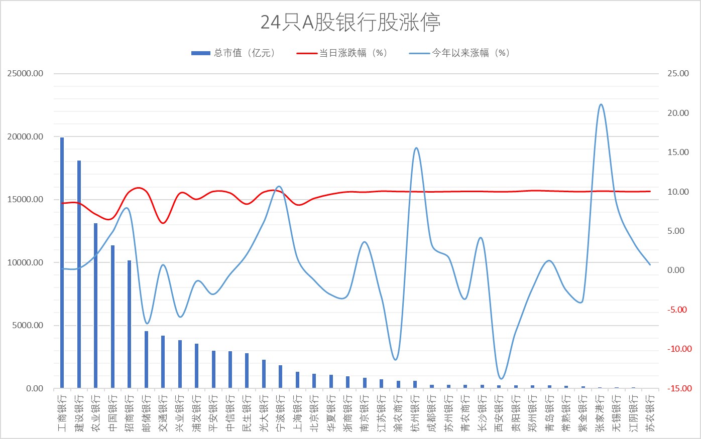 截至收盘,36只A股上市银行股,24只涨停,3只银行股触及涨停后尾盘回落。