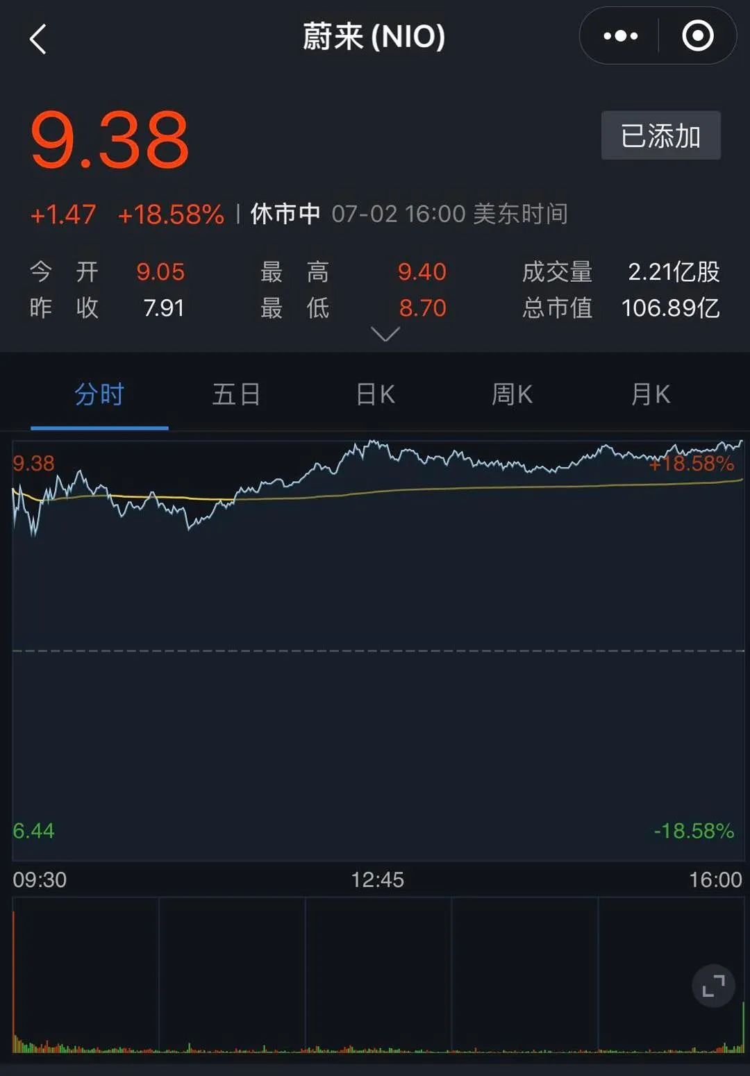 消息发布后,蔚来汽车股价大涨,截至当日美股收盘,蔚来股价上涨18.58%至9.38美元,创一年来新高,市值回归百亿美元,达到109.98亿美元。