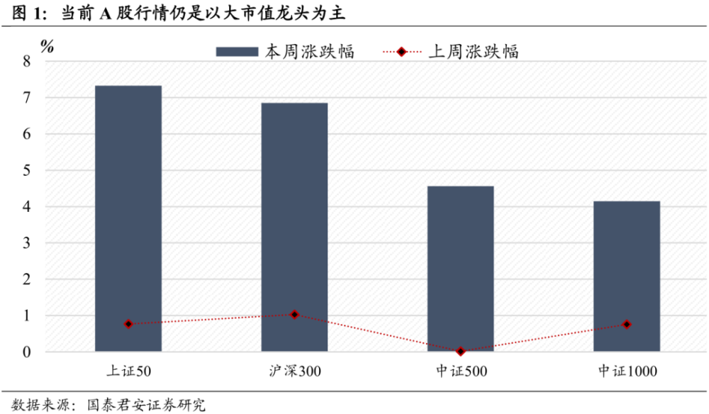 第一,当前市场行情仍以「大市值」龙头为主,「大小切换」尚未发生。结合本周与上周的市场对比,我们发现以上证50、沪深300为首的龙头权重表现显著优于中证500、中证1000,「大小切换」尚未发生。我们认为,伴随市场由「增长红利」格局向「存量竞争」转变,龙头的「竞争优势」边际提升是「大小分化」的关键。