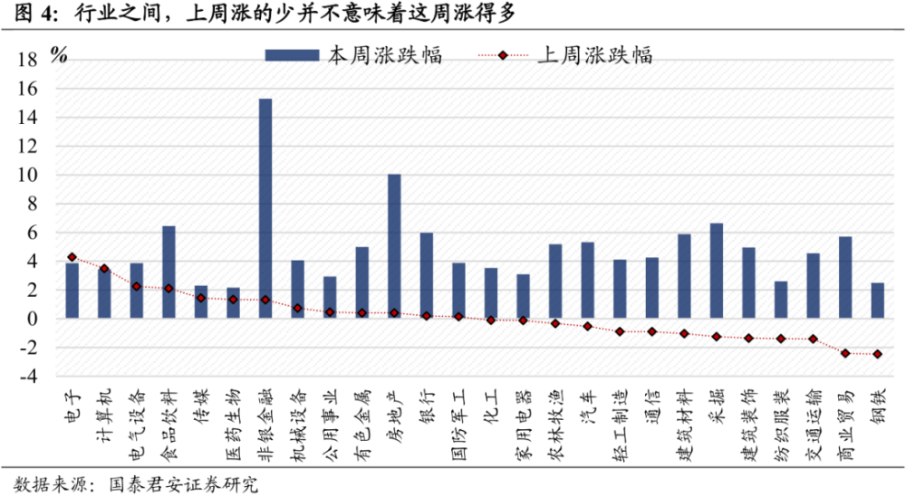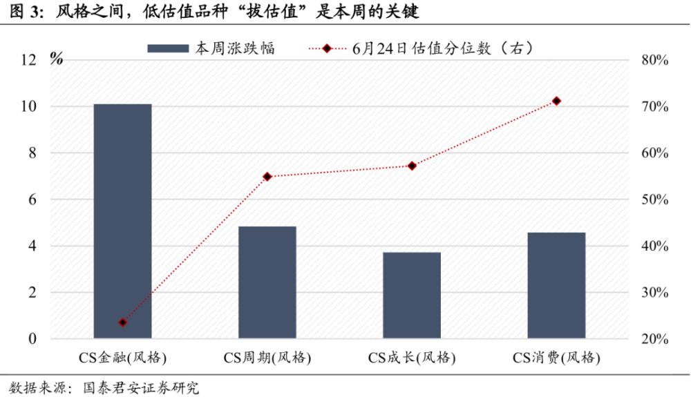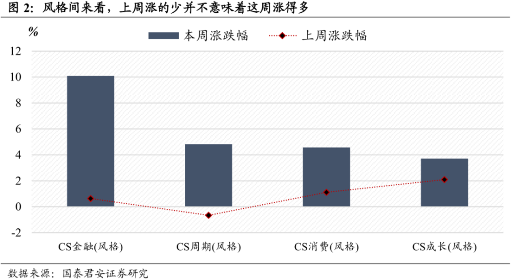 第二,涨的少不会带来涨得多,「风格之间」对比可以看到低估值风格表现更优。结合本周和上周涨跌幅来看,并不存在上周少涨而本周补涨的显著规律。相应的,如果参照各个风格当前的估值水平,我们发现「估值相对便宜」的「金融」、「周期」,表现显著优于「估值相对贵」的「成长」、「消费」。