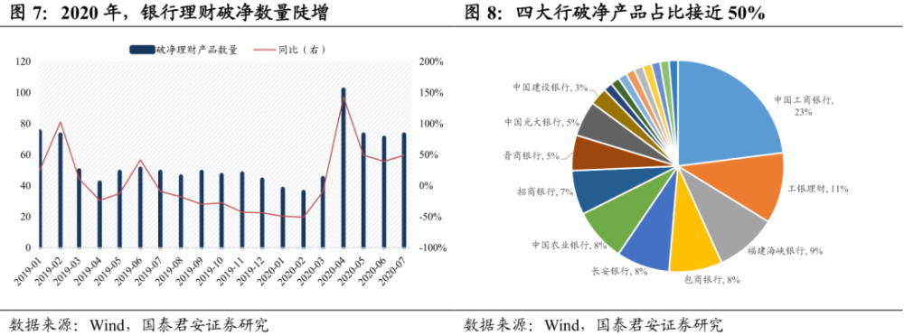 一个直接的催化:银行理财产品走向「破净」,叠加权益市场「相对收益率」显现。迹象虽微,但能反应大势。2020年4月以来,银行理财破净数量同比陡增;相较2019年同期,7月最新银行理财破净数量已达74只,这进一步体现了银行理财打破刚兑、收益率弱化的特征。破净是否是小银行管理能力差异带来的样本偏差?非也。我们拆分了破净的银行理财产品情况,其中工行占比达到23%、工银理财占比达11%、农业银行占比达8%、建设银行占比达3%、中国银行占比达1%,四大行占比合计接近50%。并不是因为管理能力或者银行样本的差异,大中小银行占比相对均衡,反映的是整体银行理财收益率水平将不断走低。在此背景之下,权益市场的投资价值凸显,「风险-收益比」显得更加有吸引力。
