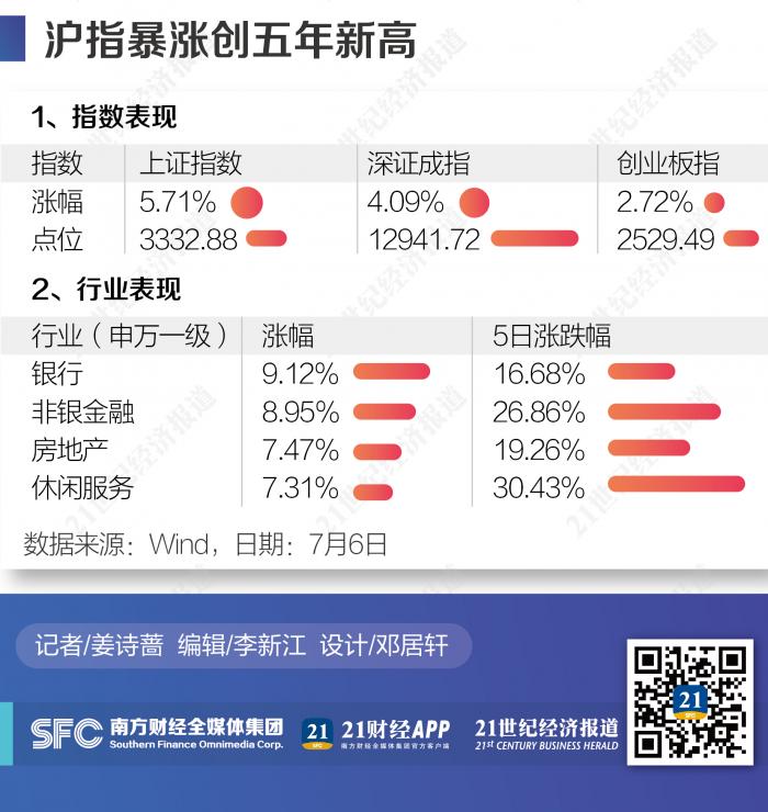 7月6日,市场大幅上涨。截至当日收盘,上证指数报3332.88点,收涨5.71%,创下5年来最大日涨幅;深证成指报12941.72点,收涨4.09%,创业板指报2529.49点,收涨2.72%。
